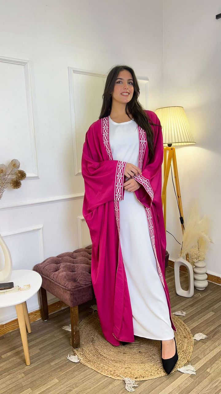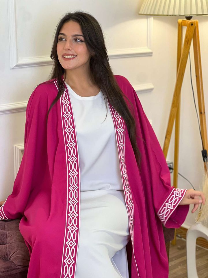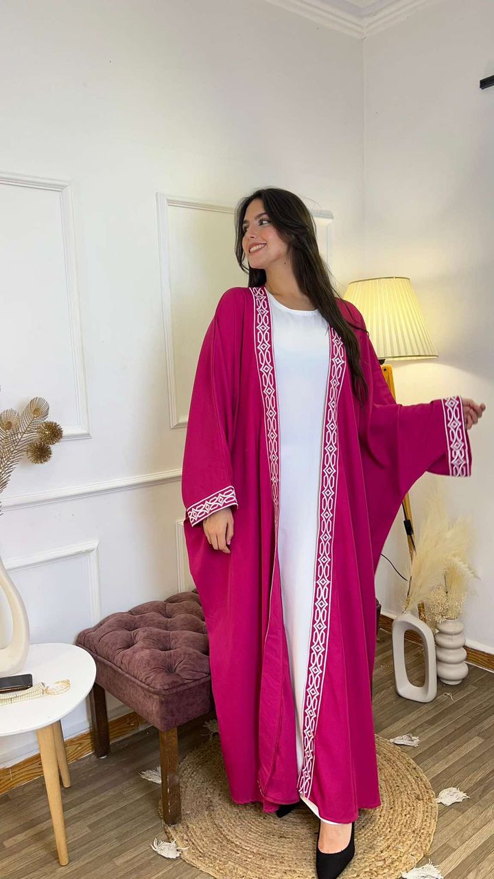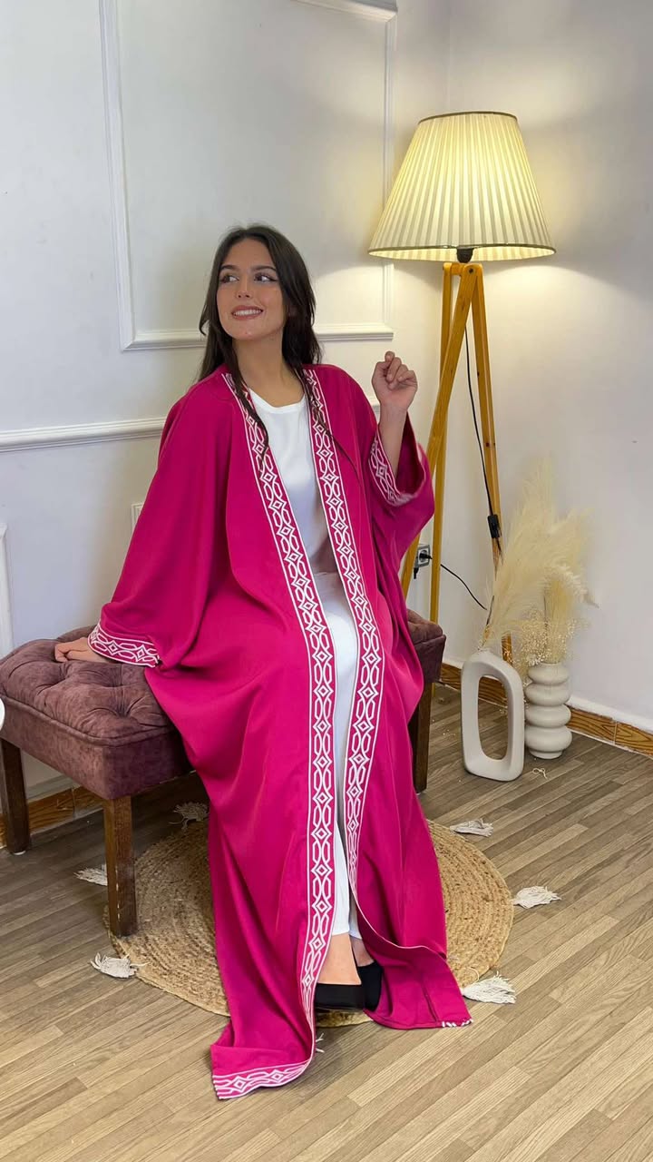 عباية فاخرة مصممة بطابع عصري وأنيق، تتميز بلونها الوردي الجذاب الذي يعكس الأنوثة والرقي. تزينها تطريزات راقية على الحواف والأكمام لتضفي لمسة من الفخامة. تأتي بقصة فضفاضة مريحة مناسبة لجميع المقاسات، مما يجعلها مثالية للمناسبات الخاصة والإطلالات اليومية المميزة. اختاريها لتتألقي بإطلالة استثنائية تجمع بين البساطة والأناقة.